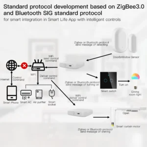 1.Sub-device control as multi-mode compatible:Control sub-devices of the gateway, supporting remote control and group control for connected Bluetooth and ZigBee smart devices in Smart Life App as multi-protocol communication for ZigBee3.0 standard protocol and Bluetooth SIG standard protocol based,ensuring stable control of 128 devices as strong performance.