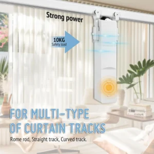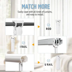 Multiple Tracks Compatibility: This automatic curtain opener is designed to be compatible with three types of curtain tracks: Roman rod track , T-shaped track and U-shaped track.(Please note that: Not applicable to extension poles. The surface of the curtain rod needs to have no joints.) Whether it's in your bedroom, living room, office or nursery, our smart curtain machines are easy to install and use.